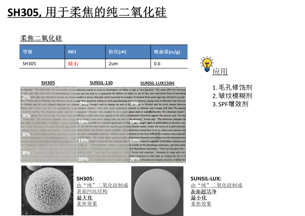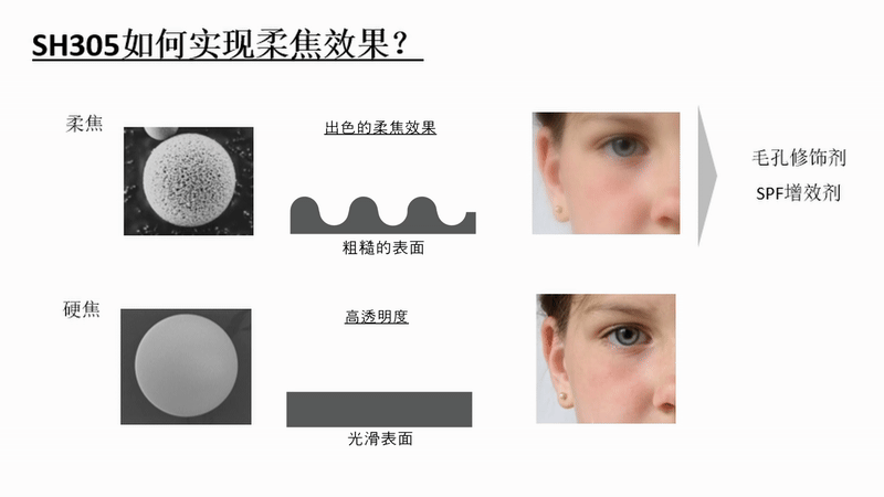 简而言之,SH305 是一种创新材料,既通过柔焦效果满足了对无瑕肌肤的美学需求,又以SPF增效剂的身份满足了防晒的功能需求。