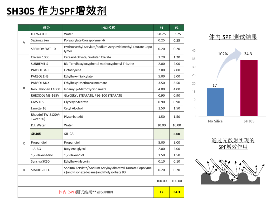 SPF值较基准值提升超一倍,且这一改善源于 SH305 独特的分散机制,而非简单的加和效应。