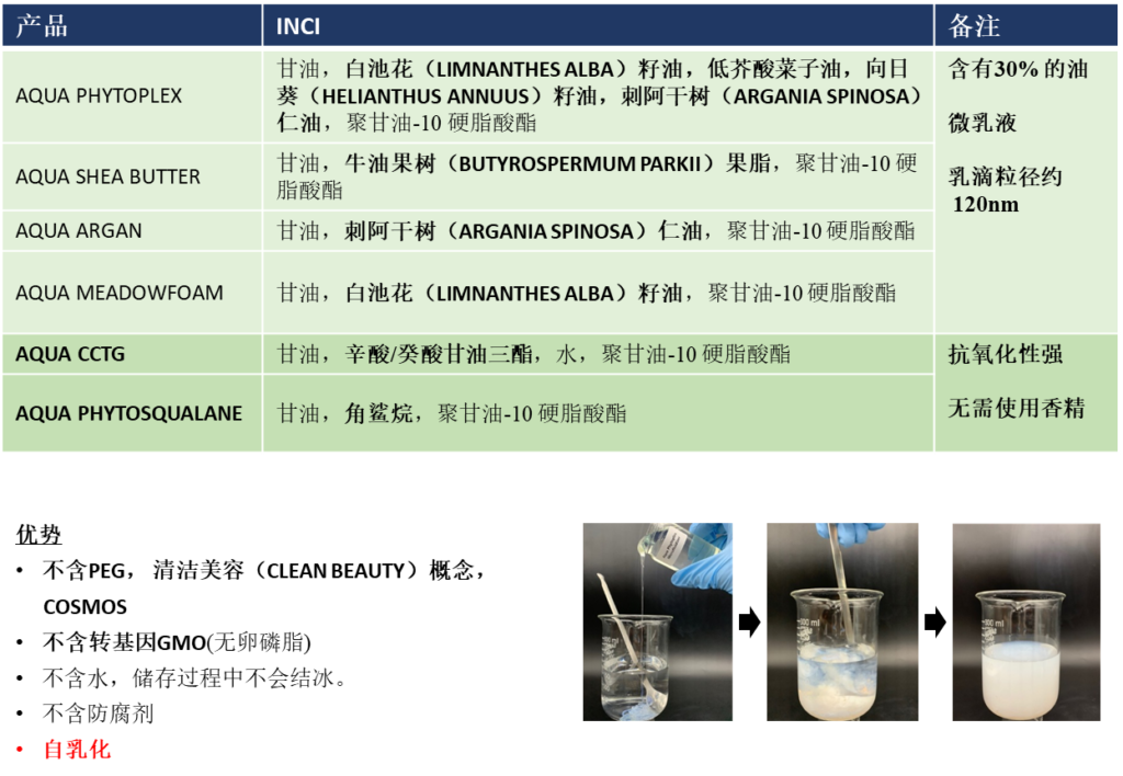 AQUA Oil是一种半透明微乳剂,经设计可仅通过简单搅拌就将天然保湿油均匀分散于水相中,无需专用乳化设备。
