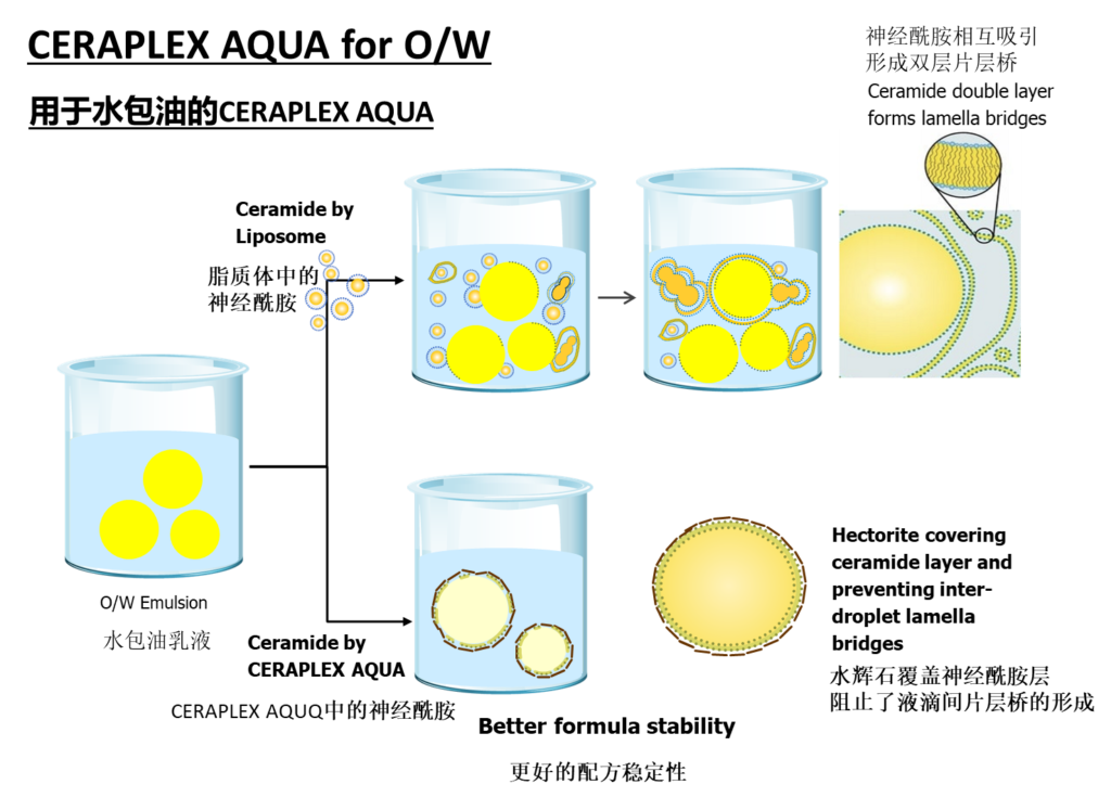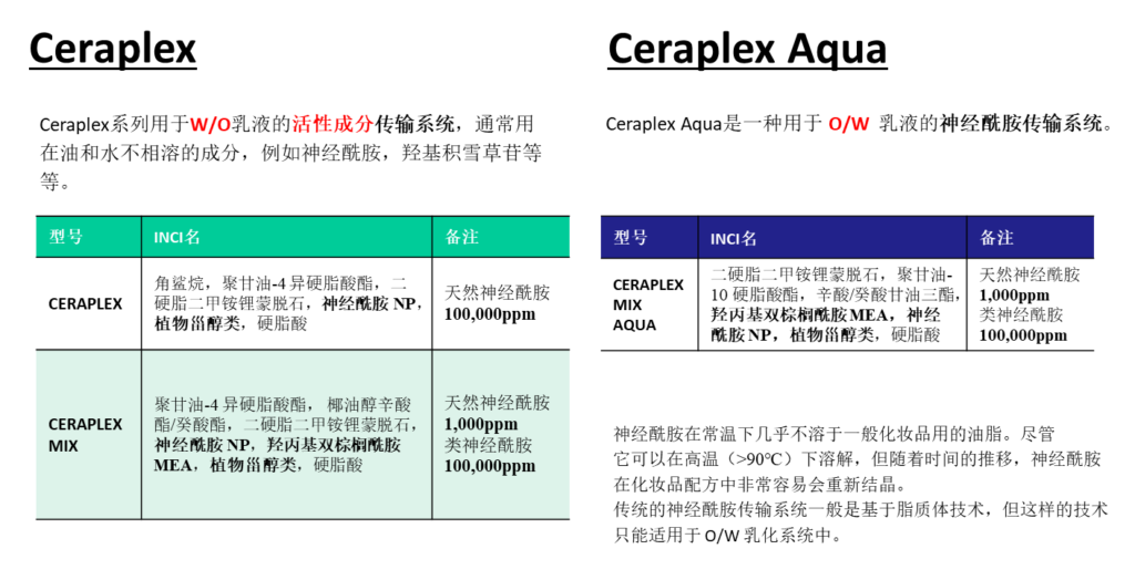 Ceraplex 系列是全球首款专属技术,可针对天然与合成类神经酰胺,同时适配油相及水相配方,实现高浓度神经酰胺的稳定递送。