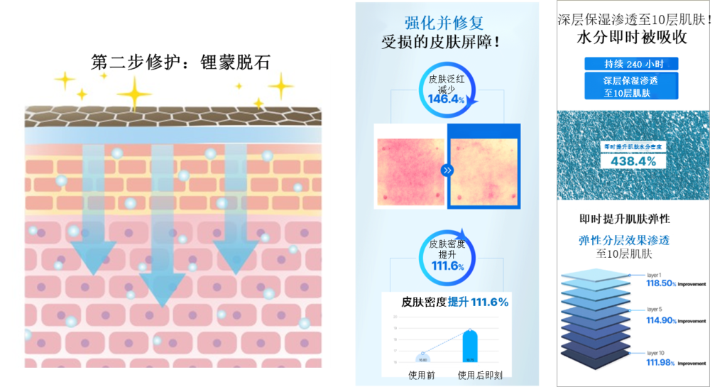 锂蒙脱石会在肌肤表面形成物理防护膜,以此抑制水分蒸发;同时它还可充当次级屏障,帮助肌肤抵御外界刺激物的侵袭。