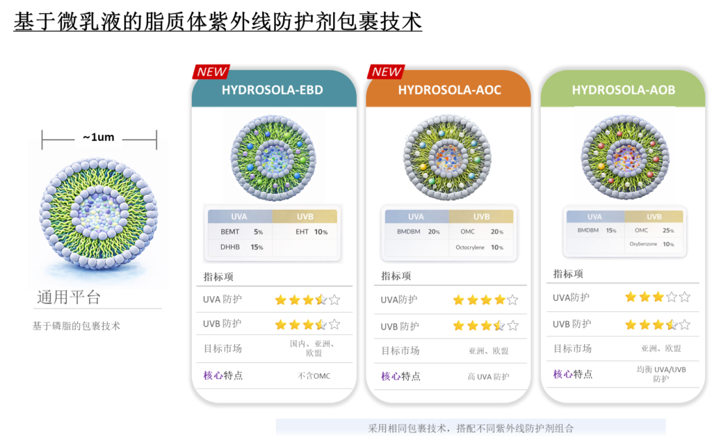 此外,HYDROSOLA 系列支持多种有机紫外线过滤剂的选择,可根据配方需求与目标应用场景进行优化搭配。