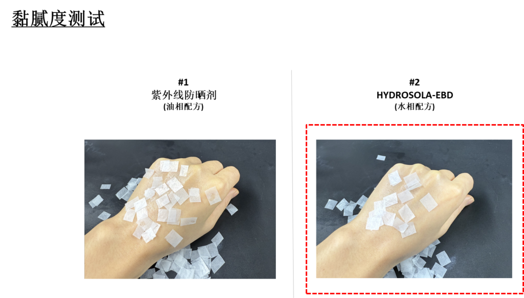 使用HYDROSOLA的配方相比传统有机防晒剂配方,能带来清爽、不黏腻、轻盈的肤感。这得益于防晒剂的多层包裹技术,可在涂抹时最大程度减少皮肤表面的残留感。