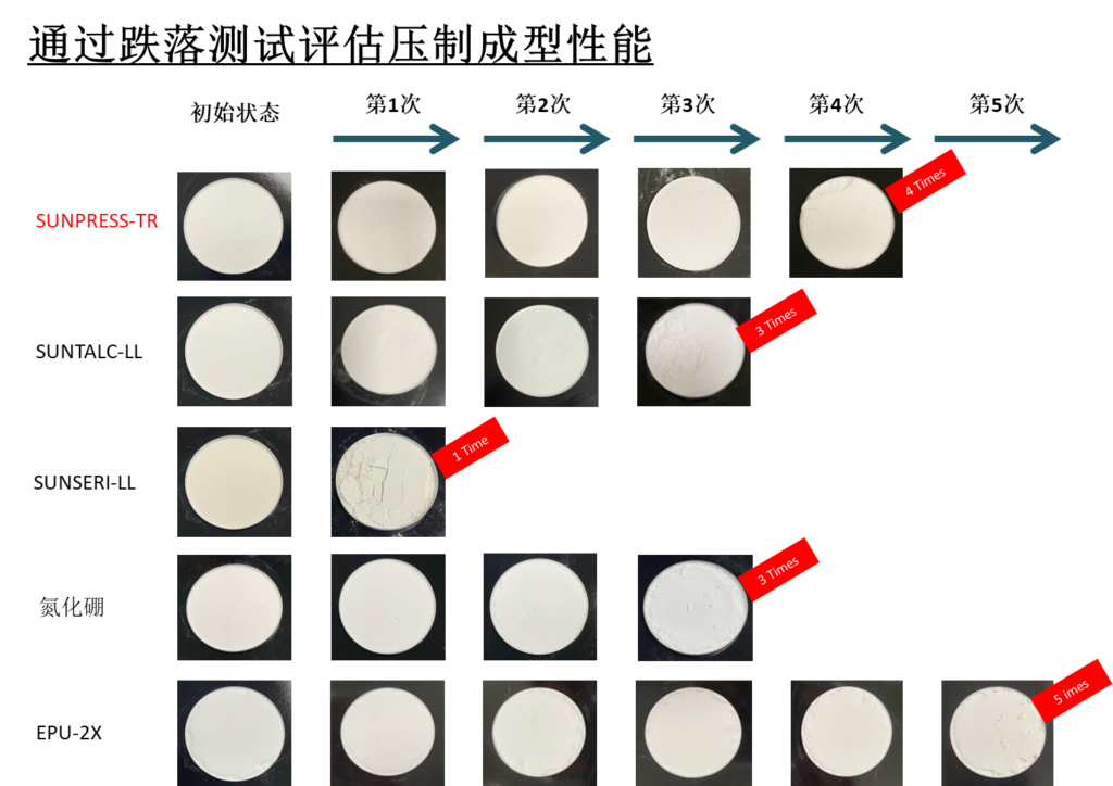 • 卓越的压制成型性能与耐用性:经过100%单一成分压制成型后,跌落测试结果表明,其抗冲击性优于传统滑石粉。SUNPRESS-TR能有效解决眼影和粉饼常见的碎裂问题。