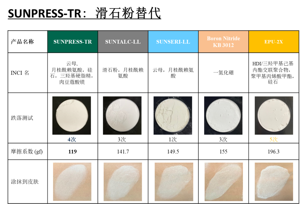 • 卓越的柔滑性能:流变仪测试结果显示,与表面处理的滑石粉和绢云母相比,SUNPRESS-TR的摩擦系数显著降低。涂抹时,能即刻感受到如天鹅绒般的柔滑触感。