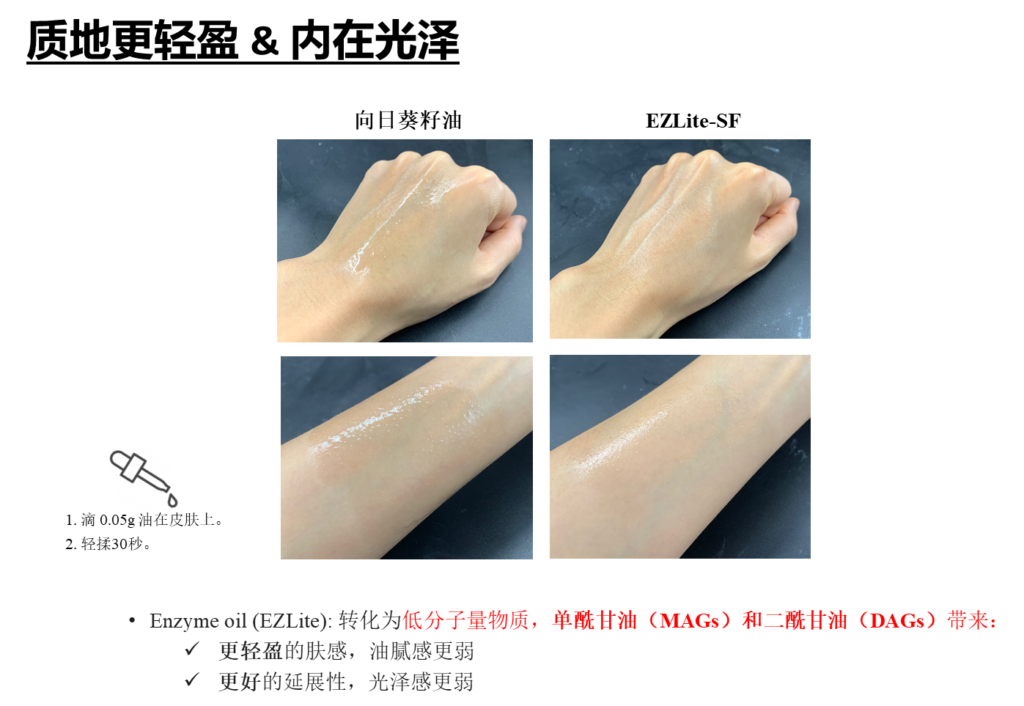 这款酵素油EZLite-SF,成功攻克了焕亮配方中 “油腻感” 和“吸收缓慢” 两大行业性难题。