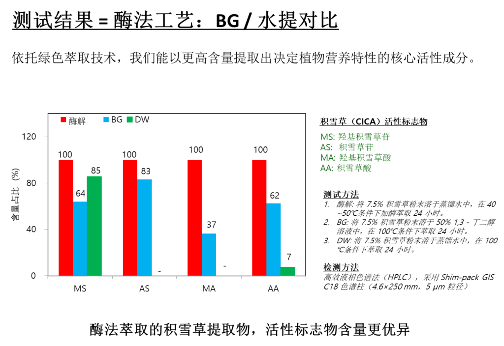 在积雪草提取物中,经检测,其核心标志性成分(包括羟基积雪草苷、积雪草苷、羟基积雪草酸、积雪草酸)的含量,均显著高于传统水提及溶剂(丁二醇)提提取物。