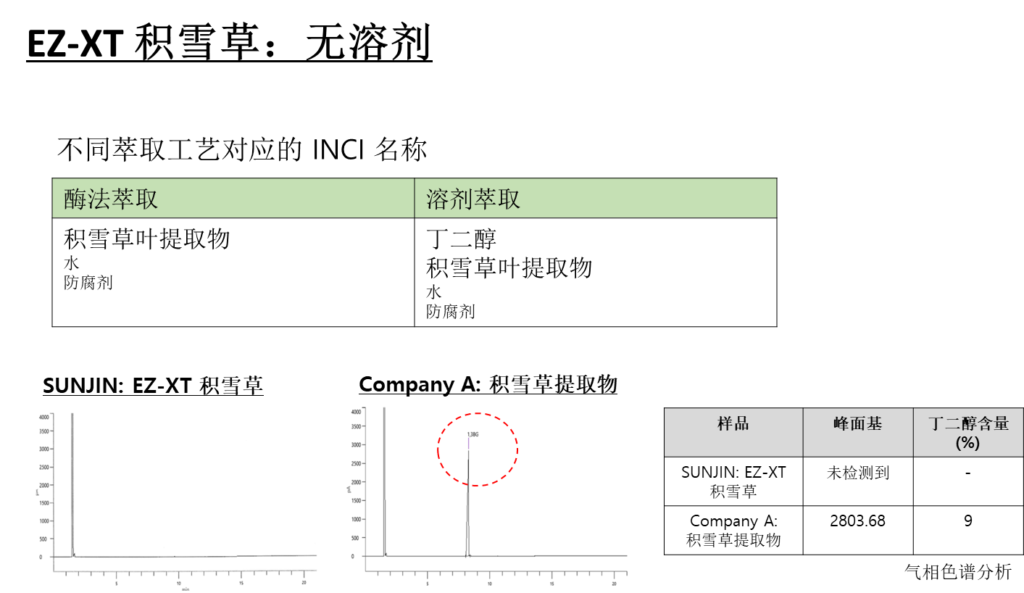 此外,SUNJIN 提取物在配方中不添加多元醇作为溶剂。